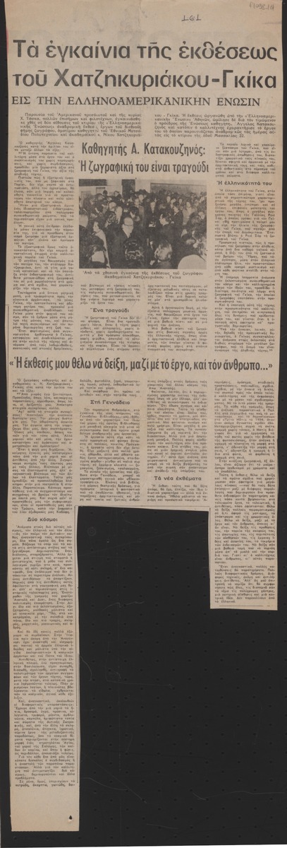 Απόκομμα της εφημερίδας “Ελεύθερος Κόσμος” (1973), όπου δημοσιεύεται άρθρο με θέμα τα εγκαίνια έκθεσης του Νίκου Χατζηκυριάκου-Γκίκα στην Ελληνοαμερικανική Ένωση. Σχολιάζονται τα έργα που παρουσιάζονται.