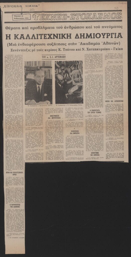 Απόκομμα της εφημερίδας “Ελεύθερος Κόσμος” (10/02/1974), όπου δημοσιεύεται συνέντευξη των Θ. Τσάτσου και Ν. Χ”κυριάκου-Γκίκα, για την καλλιτεχνική δημιουργία. Οι ακαδημαϊκοί εκφράζουν τις απόψεις τους σε ερωτήματα σχετικά με την Τέχνη.