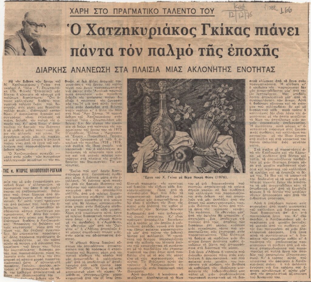 Απόκομμα της εφημερίδας “Η Καθημερινή” (12/12/1976), όπου δημοσιεύεται κριτική έκθεσης του Νίκου Χατζηκυριάκου-Γκίκα, η οποία διεξάγεται στην γκαλερί Ιόλα Ζουμπουλάκη στην Αθήνα. Σχολιάζονται τα έργα του καλλιτέχνη.