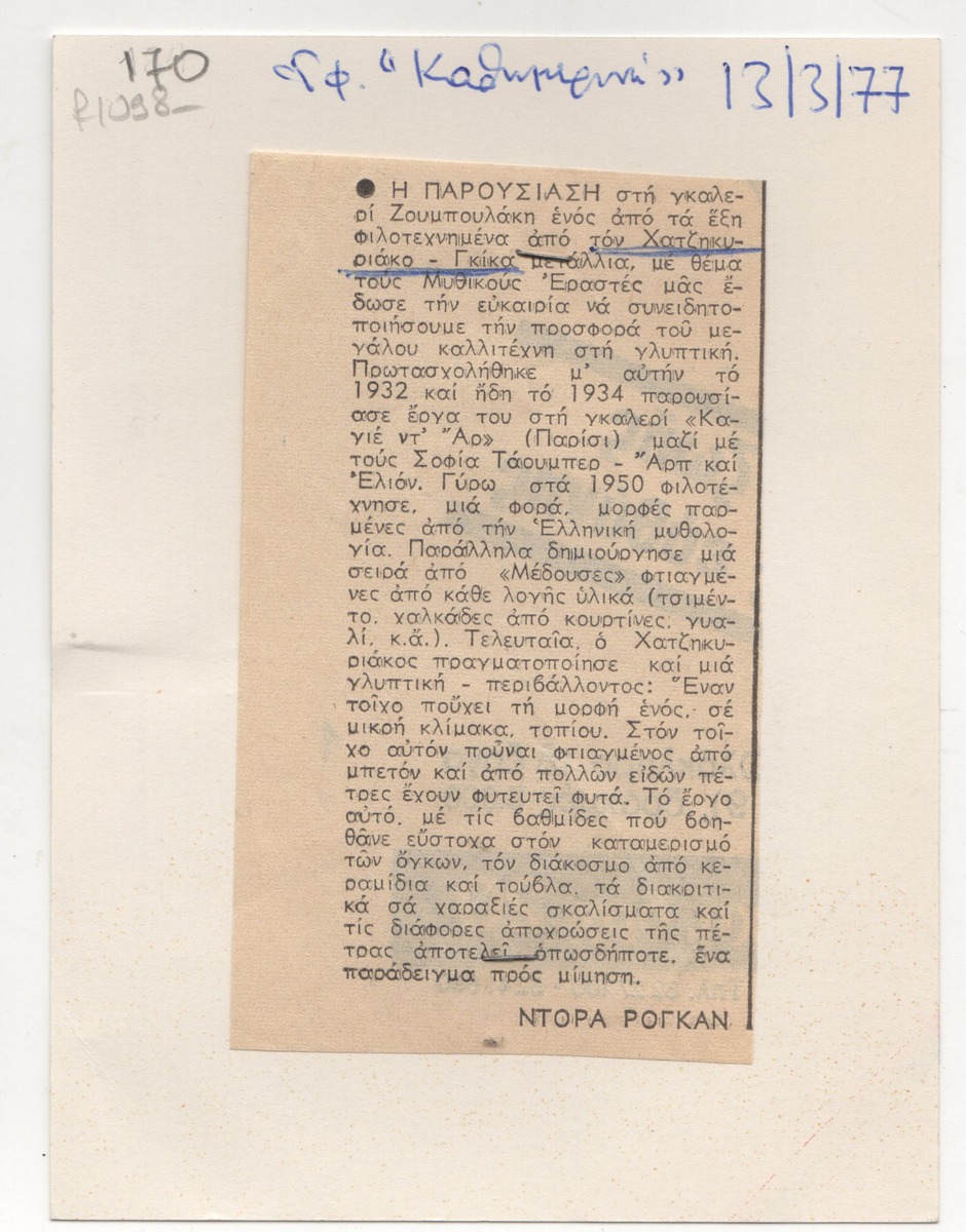 Απόκομμα της εφημερίδας “Η Καθημερινή” (13/03/1977), όπου δημοσιεύεται άρθρο με θέμα το συνολικό έργο του Νίκου Χατζηκυριάκου-Γκίκα, με αφορμή έκθεση μεταλλίων του καλλιτέχνη με τίτλο “Μυθικοί Εραστές”, στην γκαλερί Ιόλα-Ζουμπουλάκη στην Αθήνα.