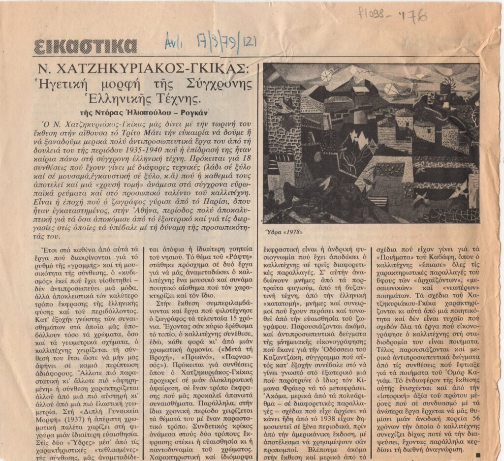 Απόκομμα του περιοδικού “Αντί” (17/03/1979), όπου δημοσιεύεται κριτική έκθεσης του Νίκου Χατζηκυρικάκου-Γκίκα, η οποία διεξάγεται στην Αίθουσα Το Τρίτο Μάτι στην Αθήνα.