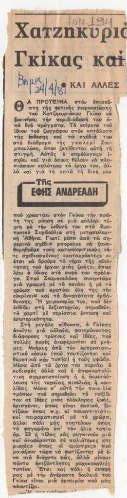Απόκομμα της εφημερίδας “Η Καθημερινή” (24/04/1981), όπου δημοσιεύεται κριτική έκθεσης του Νίκου Χατζηκυριάκου-Γκίκα, η οποία διεξάγεται στην Γκαλερί Ζουμπουλάκη στην Αθήνα.