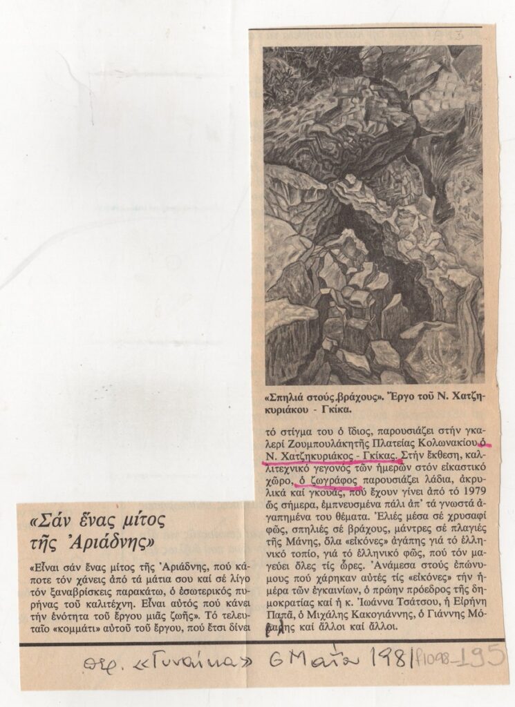 Απόκομμα του περιοδικού “Γυναίκα” (06/05/1981), όπου δημοσιεύεται άρθρο με θέμα την έκθεση του Νίκου Χατζηκυριάκου-Γκίκα, η οποία διεξάγεται στην Γκαλερί Ζουμπουλάκη στην Αθήνα.