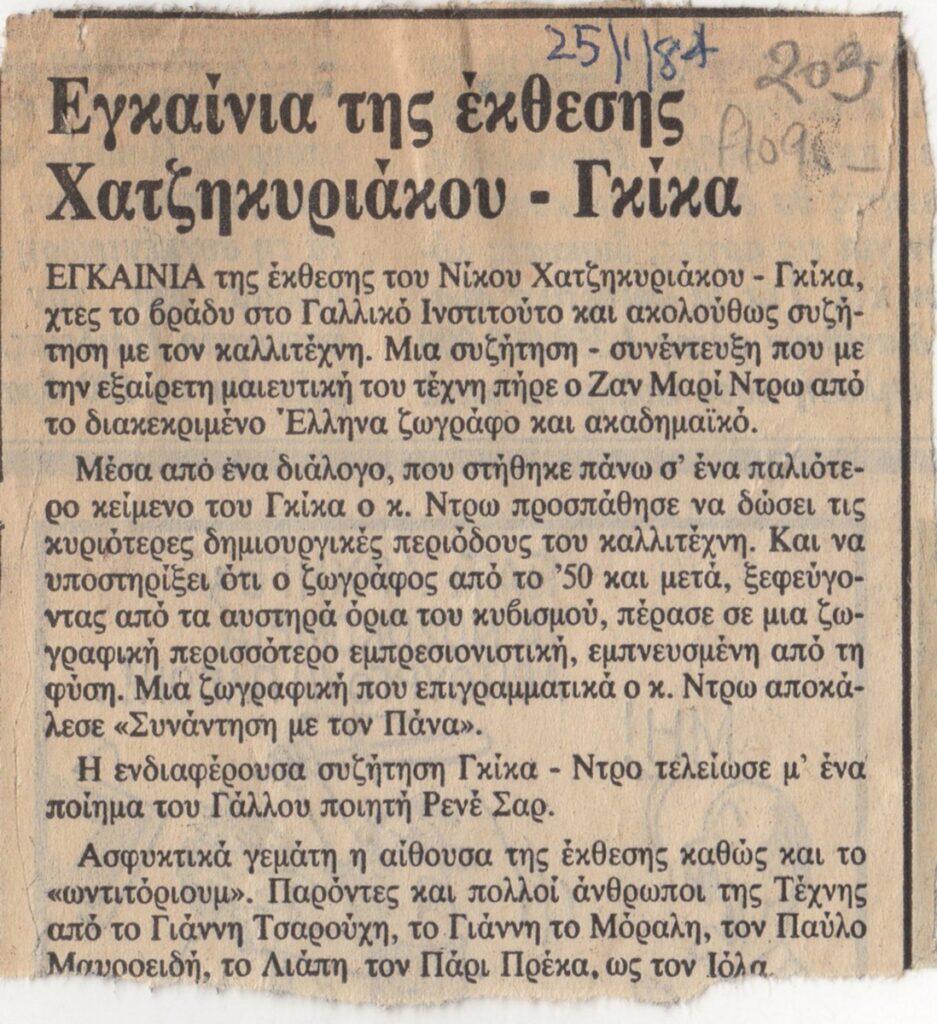 Απόκομμα εφημερίδας (25/01/1984), όπου δημοσιεύεται άρθρο με θέμα τα εγκαίνια έκθεσης του Νίκου Χατζηκυριάκου-Γκίκα, η οποία διεξάγεται στο Γαλλικό Ινσιτιτούτο Αθηνών.
