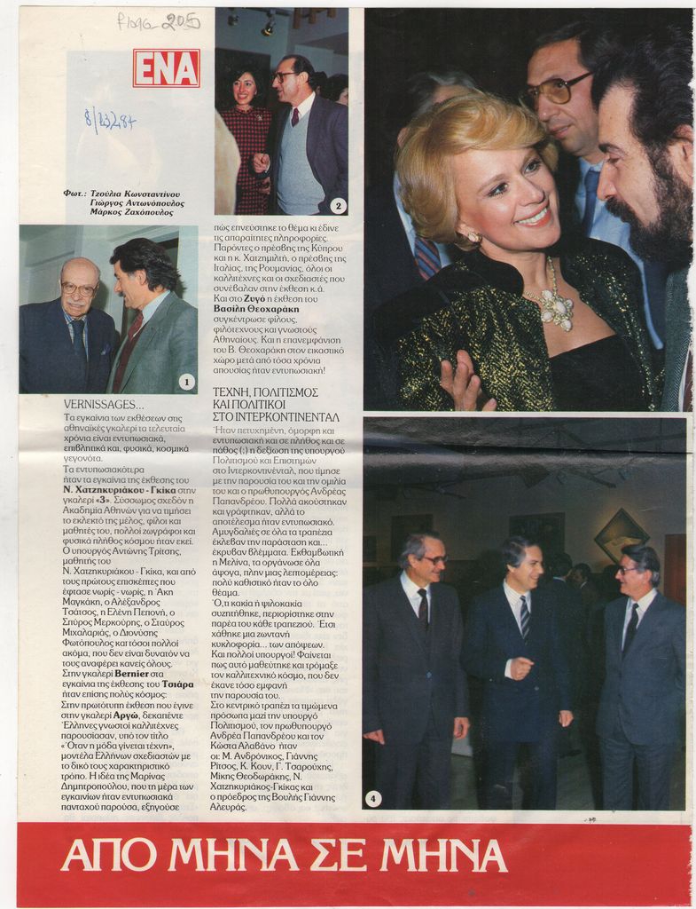 Απόκομμα του περιοδικού “Ένα” (23/02/1984), όπου δημοσιεύεται στήλη αναφερόμενης σε εγκαίνια εκθέσεων της περιόδου. Ειδικότερα, δίνονται πληροφορίες για τα εγκαίνια εκθέσεων του Νίκου Χατζηκυριάκου-Γκίκα, στην Γκαλερί 3, του Κώστα Τσάρα στην γκαλερί Bernier, ομαδικής στην Αργώ και του Βασίλη Θεοχαράκη στον Ζυγό.