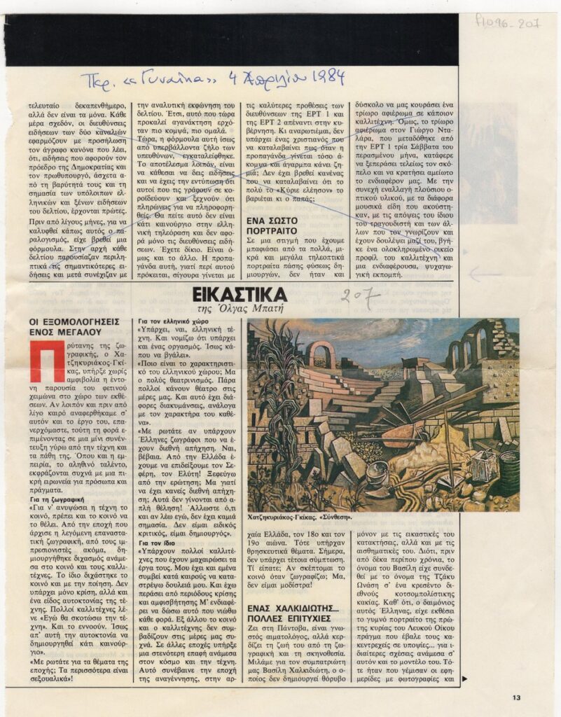 Απόκομμα του περιοδικού “Γυναίκα” (04/04/1984), όπου δημοσιεύεται συνέντευξη του Νίκου Χατζηκυριάκου-Γκίκα. Στο ίδιο, άρθρο για τον Βασίλη Χαλκιδιώτη και το εικαστικό έργο του και αναφορά σε εκθέσεις της περιόδου. Ανάμεσα σε αυτές της Αθηνάς Κάρκστεν- Πολιτοπούλου στον Ζυγό, του Κώστα Κατσουρή στην Εθνική Πινακοθήκη, του Λευτέρη Κανακάκη στις Νέες Μορφές.