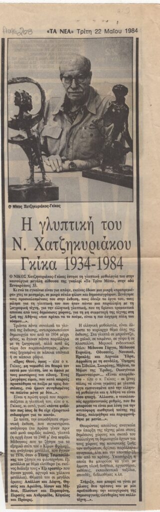 Απόκομμα της εφημερίδας “Τα Νέα” (22/05/1984), όπου δημοσιεύεται άρθρο με θέμα την έκθεση γλυπτών του Νίκου Χατζηκυριάκου-Γκίκα, η οποία διεξάγεται στην αίθουσα Το Τρίτο Μάτι στην Αθήνα.