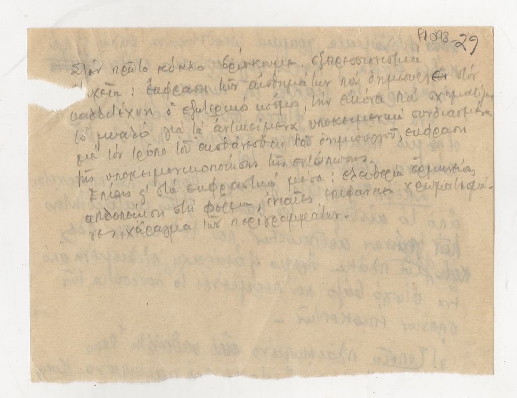 Κείμενο του Τώνη Σπητέρη, χειρόγραφο, χαρτί διπλής όψης, 11.5×15 εκ., στα ελληνικά, στο οποίο σχολιάζει τα χαρακτηριστικά μίας από τις εικαστικές περιόδους του Νίκου Χατζηκυριάκου-Γκίκα.