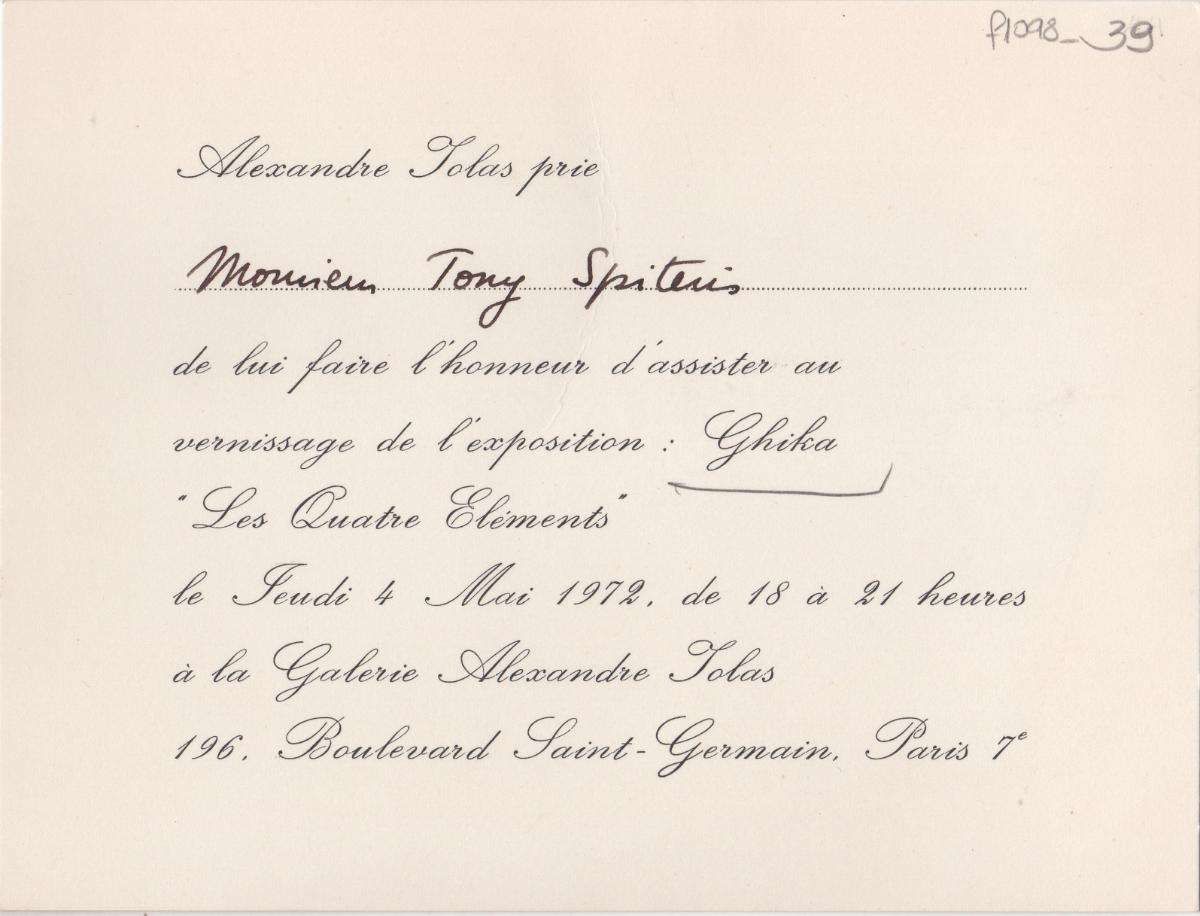 Πρόσκληση εγκαινίων έκθεσης του Νίκου Χατζηκυριάκου-Γκίκα στην Galerie Alexandre Iolas στο Παρίσι.