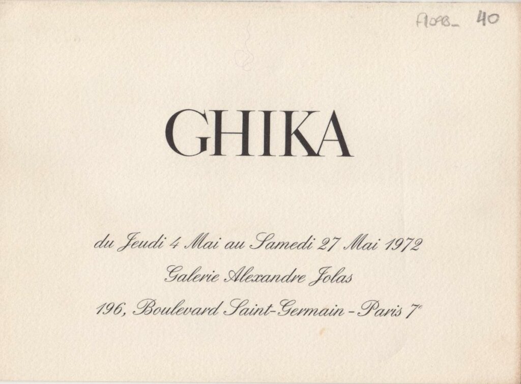 Πρόσκληση εγκαινίων έκθεσης του Νίκου Χατζηκυριάκου-Γκίκα στην Galerie Alexandre Iolas στο Παρίσι.
