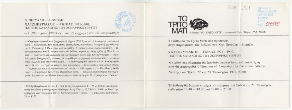 Πρόσκληση σε παρουσίαση βιβλίου του Νίκου Πετσάλη -Διομήδη, αφιερωμένου στη ζωγραφική του Νίκου Χατζηκυριάκου- Γκίκα στην Αίθουσα “Το Τρίτο Μάτι” στην Αθήνα.
