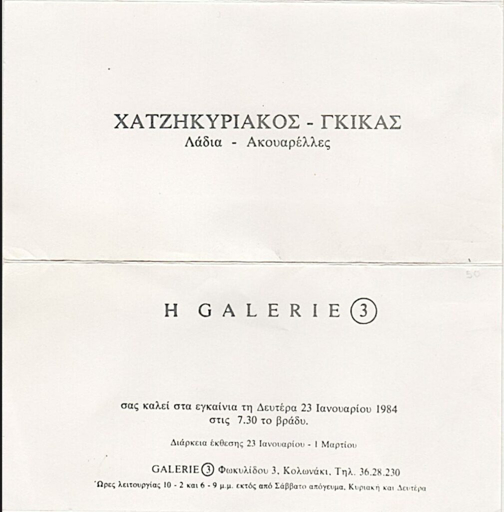 Πρόσκληση εγκαινίων έκθεσης του Νίκου Χατζηκυριάκου Γκίκα στην Γκαλερί 3 στην Αθήνα απεσταλμένη στον Τώνη Σπήτερη.