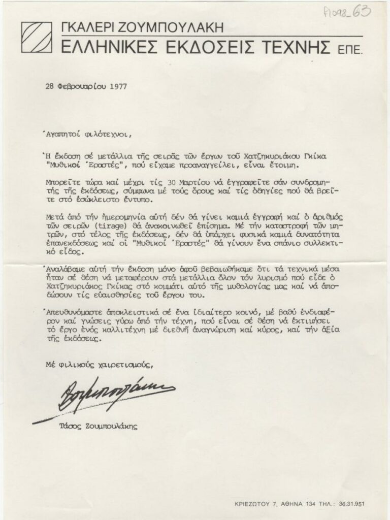 Φωτοαντίγραφο δελτίου τύπου, χαρτί αναφερόμενου σε κυκλοφορία σειράς μεταλλίων του Νίκου Χατζηκυριάκου-Γκίκα. Δίνονται πληροφορίες για τον τρόπο απόκτησής τους.