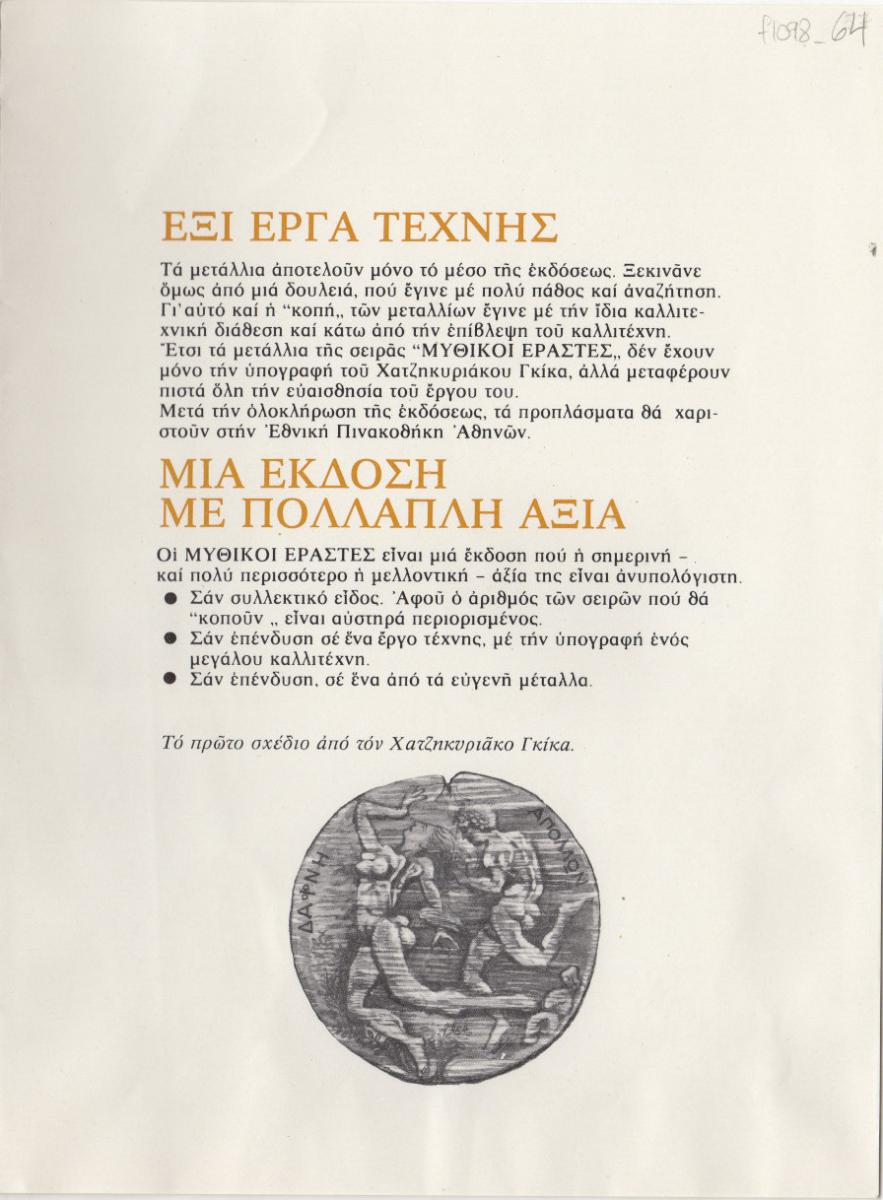 Ενημερωτικό έντυπο κυκλοφορίας σειράς μεταλλίων του Νίκου Χατζηκυριάκου-Γκίκα, με επιμέλεια της Γκαλερί Ζουμπουλάκη. Δίνονται πληροφορίες για τα μετάλλια καθώς και για τον τρόπο συνδρομής.