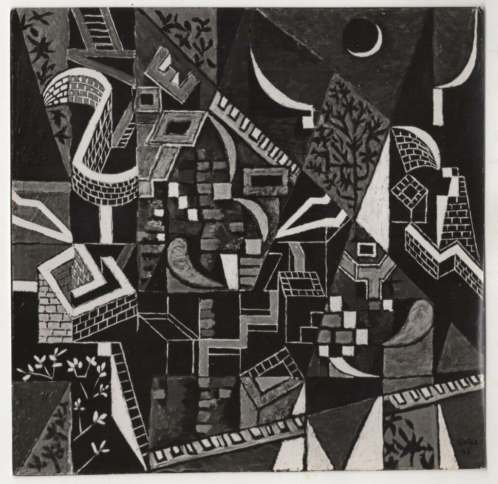 Ασπρόμαυρη φωτογραφία έργου του Νίκου Χατζηκυριάκου-Γκίκα. Στην πίσω όψη, επιγραφή.