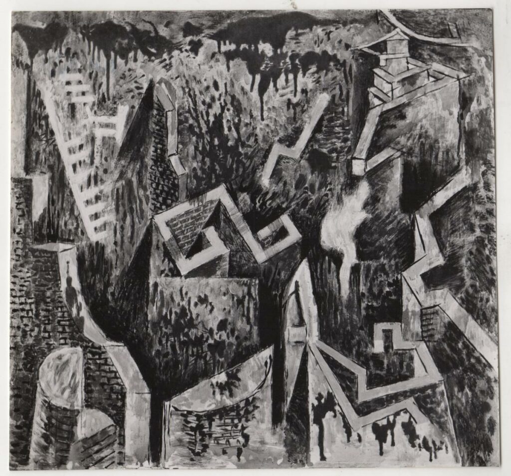 Ασπρόμαυρη φωτογραφία έργου του Νίκου Χατζηκυριάκου-Γκίκα. Στην πίσω όψη, επιγραφή.