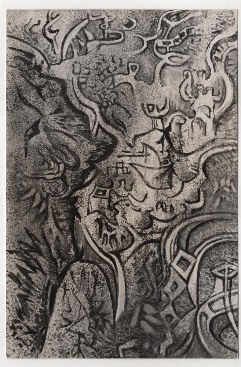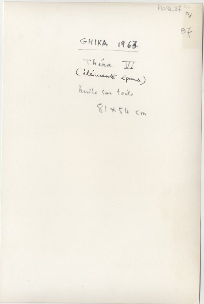 Ασπρόμαυρη φωτογραφία έργου του Νίκου Χατζηκυριάκου-Γκίκα. Στην πίσω όψη, επιγραφή.