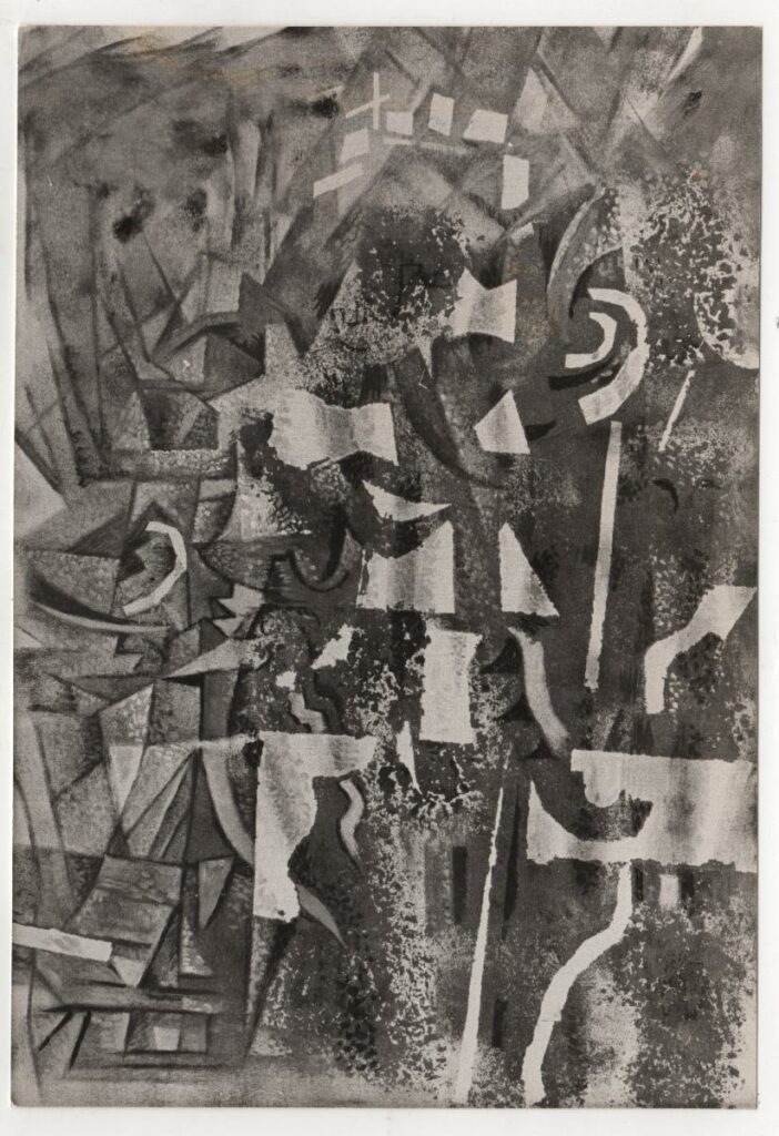 Ασπρόμαυρη φωτογραφία έργου του Νίκου Χατζηκυριάκου-Γκίκα. Στην πίσω όψη, επιγραφή.