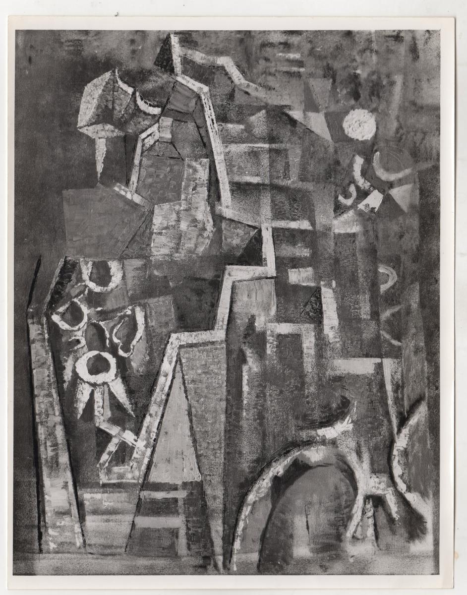 Ασπρόμαυρη φωτογραφία έργου του Νίκου Χατζηκυριάκου-Γκίκα. Στην πίσω όψη, επιγραφή.
