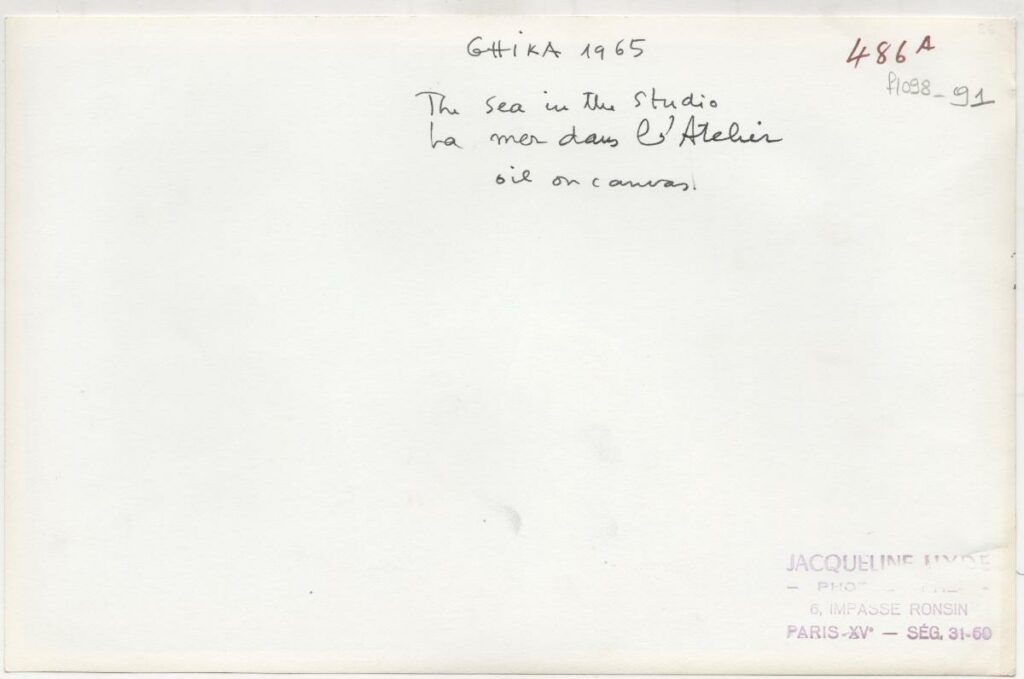 Ασπρόμαυρη φωτογραφία έργου του Νίκου Χατζηκυριάκου-Γκίκα. Στην πίσω όψη, επιγραφή.