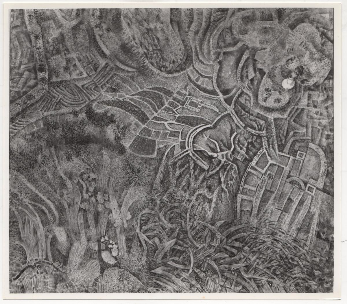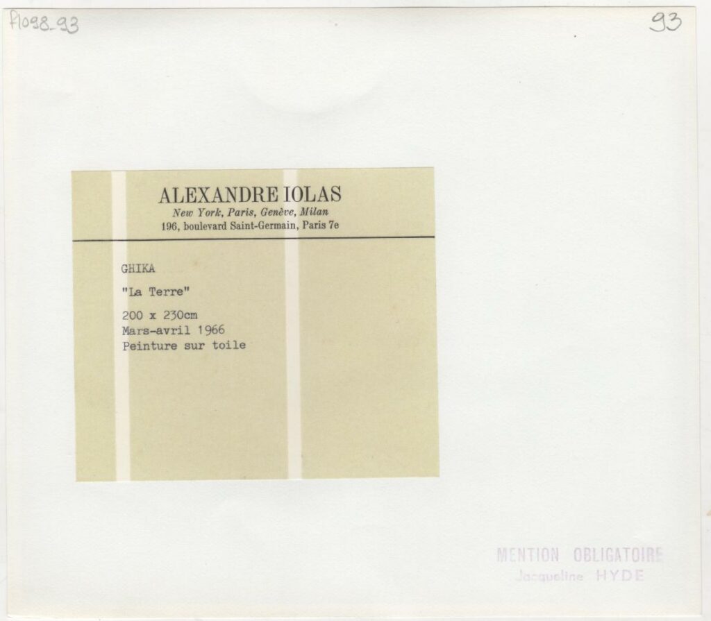 Ασπρόμαυρη φωτογραφία έργου του Νίκου Χατζηκυριάκου-Γκίκα. Στην πίσω όψη, επιγραφή.