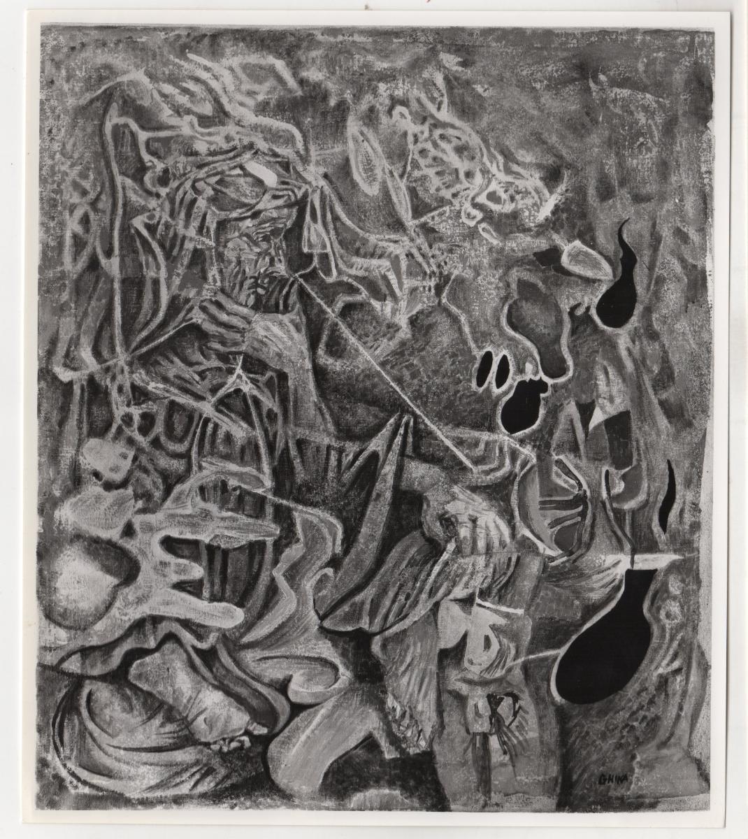 Ασπρόμαυρη φωτογραφία έργου του Νίκου Χατζηκυριάκου-Γκίκα. Στην πίσω όψη, επιγραφή.