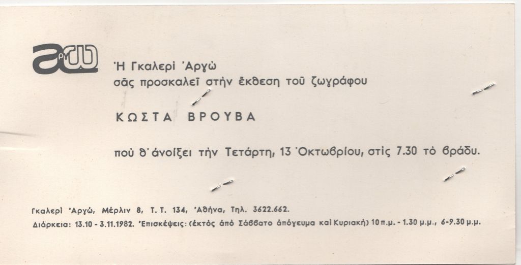 Έντυπο, μονόφυλλο, χαρτόνι, στα ελληνικά, μία όψη, 10,0×19,8 εκ. Πρόσκληση εγκαινίων της ατομικής έκθεσης ζωγραφικής του Κώστα Βρούβα στην Αθήνα το 1982.