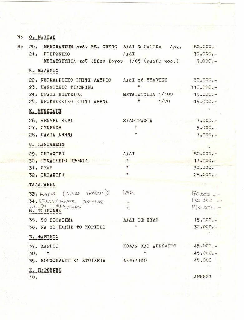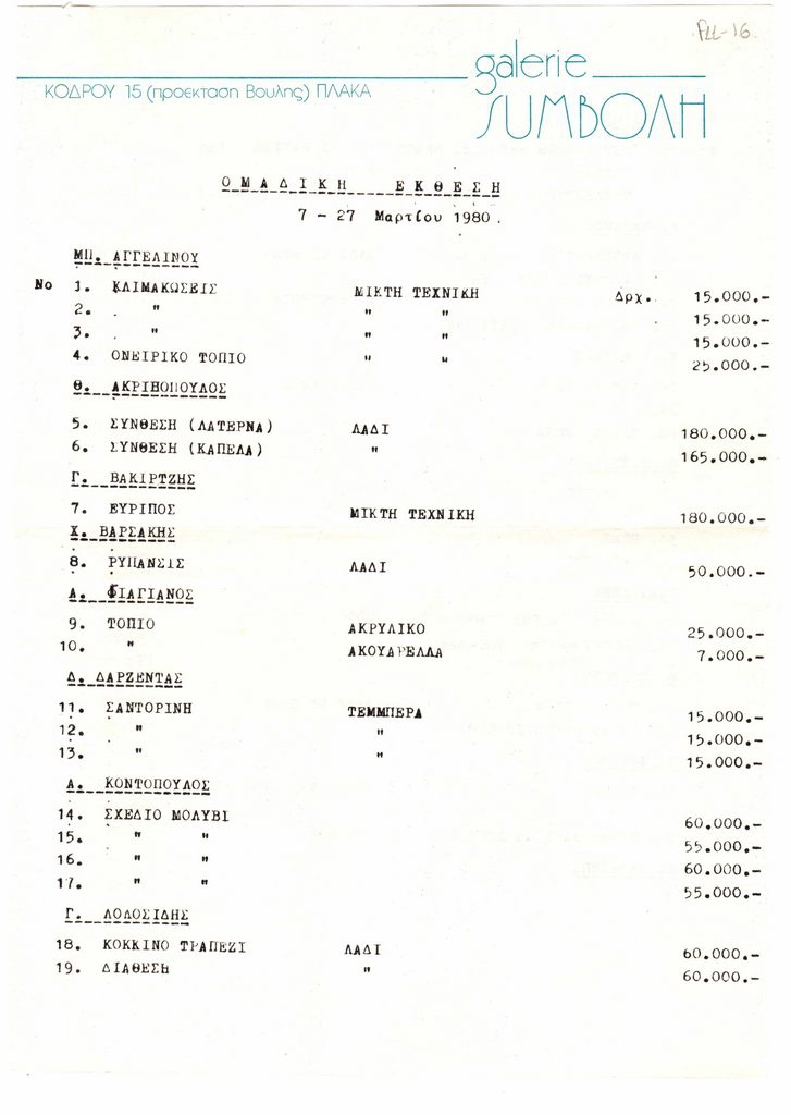 Τιμοκατάλογος, δακτυλόγραφος, χαρτί, διπλής όψης, 29,5×21 εκ, στα ελληνικά, έργων των καλλιτεχνών Μπ. Αγγελίνου, Θ. Ακριβόπουλου, Γ. Βακιρτζή, Χ. Βαρσάκη, Α. Γιαγιάννου, Δ. Δαρζέντα, Α. Κοντόπουλου, Γ. Λολοσίδη, Θ. Μάιπα, Κ. Μαλάμου, Κ. Μπεκιάρη, Θ. Πανταλέων, Ταλαγάνη, Θ. Τσιρώνη, Ε. Φαεινού, Κ. Παρθένη, με χειρόγραφες σημειώσεις.