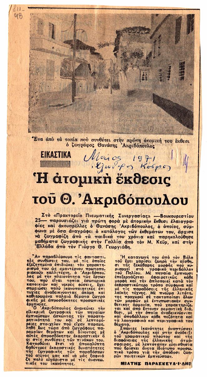 Απόκομμα, χαρτί, 21×11εκ, στα ελληνικά, δημοσίευσης άρθρου αναφερόμενου σε έκθεση του Θανάση Ακριβόπουλου, στο Πρακτορείο Πνευματικής Συνεργασίας στην Αθήνα.