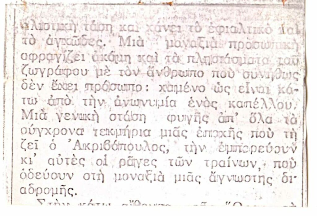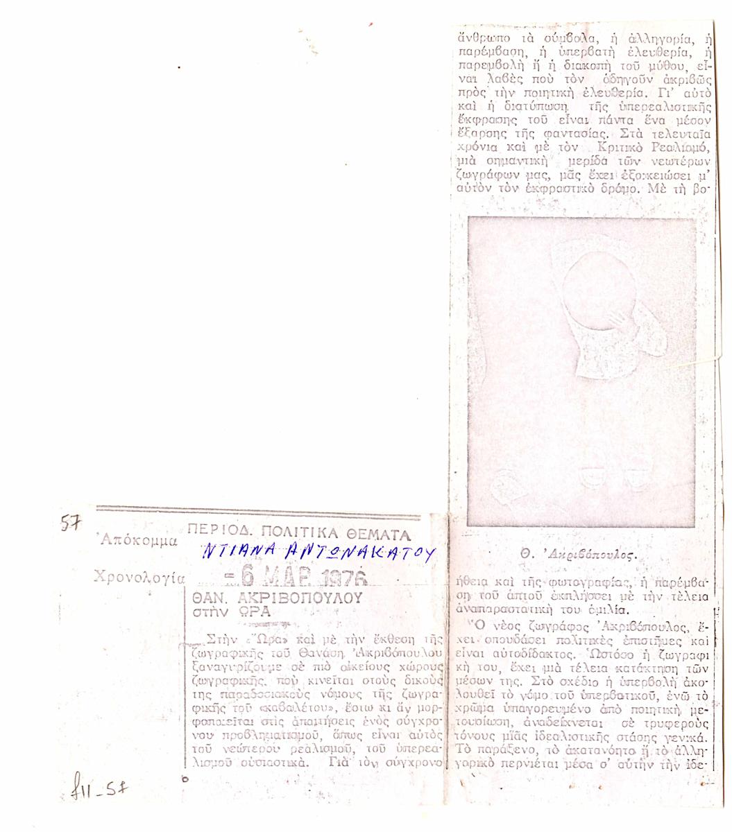 Φωτοαντίγραφο αποκόμματος, χαρτί, 2 φφ, 17,5×4,5 και 4,5×6εκ. αντίστοιχα, στα ελληνικά, με απόσπασμα κριτικής για την ατομική έκθεση του Θανάση Ακριβόπουλου, στο Καλλιτεχνικό Πνευματικό Κέντρο Ώρα, στην Αθήνα, το 1976.