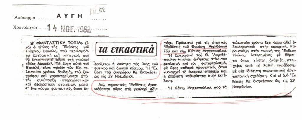 Φωτοαντίγραφο αποκόμματος, χαρτί, 8,5×21 εκ, στα ελληνικά, άρθρου το οποίο αναφέρεται σε έκθεση των Θανάση Ακριβόπουλου και Κάτιας Μητροπούλου στην Galerie Ζυγός.