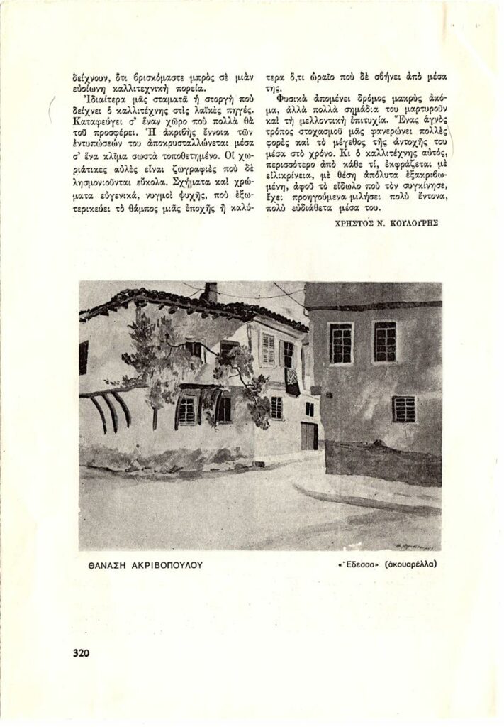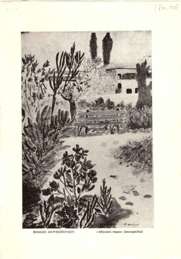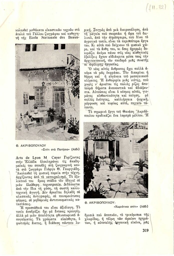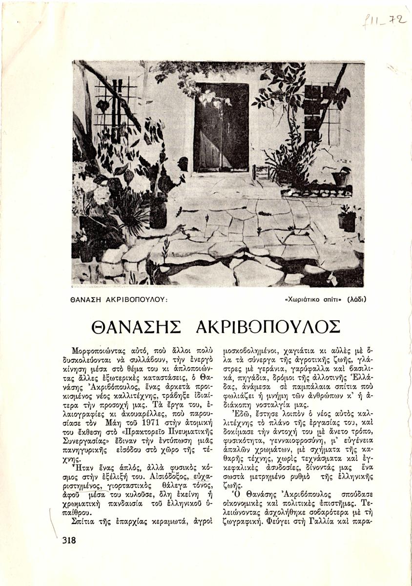 Απόκομμα, χαρτί, 3 φφ, 25×17εκ., στα ελληνικά, δημοσίευσης κειμένου για τον Θανάση Ακριβόπουλο. Στην τελευταία σελίδα του εντύπου υπάρχει απόσπασμα άρθρου με τίτλο, “Χρονικό του βιβλίου”.