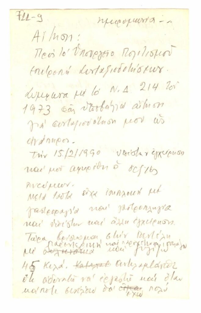Προσχέδιο αίτησης, χαρτί διπλής όψης, χειρόγραφο, με μολύβι, 14,5×8,5 εκ, στα ελληνικά, προς την επιτροπή Συνταξιοδοτήσεων του Υπουργείου Πολιτισμού.