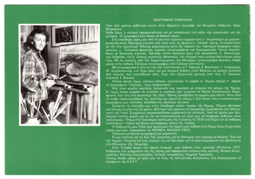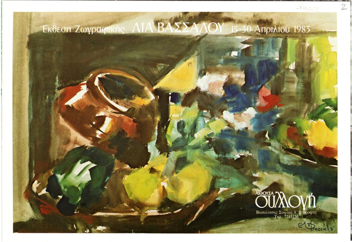 Έντυπο, χαρτόνι αναδιπλωμένο, 16,5×23,5 εκ., στα ελληνικά, ατομικής έκθεσης ζωγραφικής της Λίας Βασσάλου στην Αίθουσα Συλλογή στην Αθήνα. Περιέχει κείμενο του Ν. Μοσχονά, βιογραφικό σημείωμα και εικονογράφηση.
