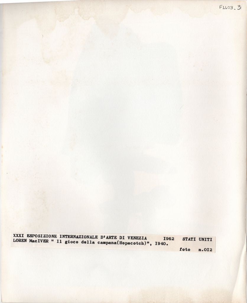 Φωτογραφία, α/μ, σε φωτογραφικό χαρτί, 25,3×20,5 εκ. Αναπαραγωγή του έργου της Loren MacIver “Il gioco della campana (Hopscotch)”, 1940 με το οποίο εκπροσώπησε τις Η.Π.Α. στην 31η Biennale της Βενετίας. Στην πίσω όψη επικολλημένη ετικέτα με τα στοιχεία του έργου και της έκθεσης όπου παρουσιάστηκε.