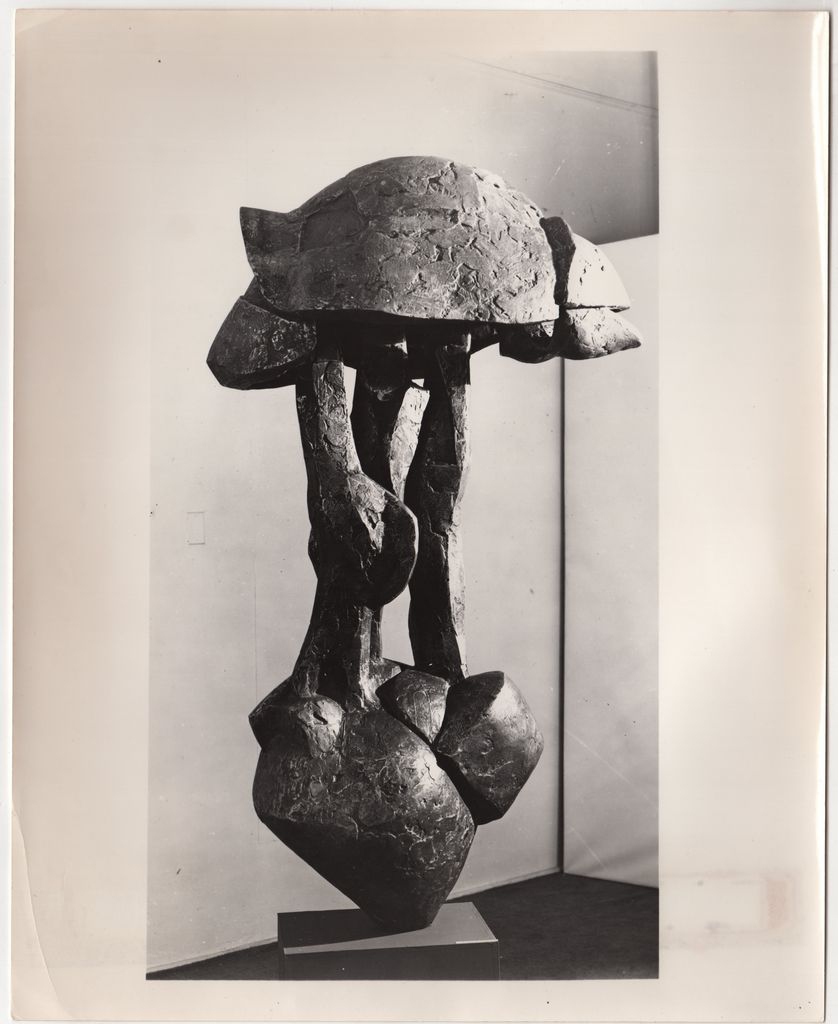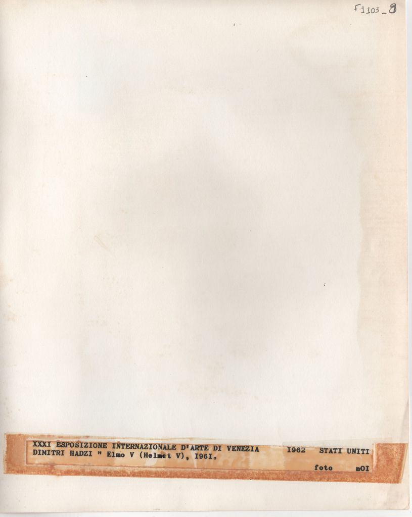 Φωτογραφία, α/μ, σε φωτογραφικό χαρτί, 25,5×20,5 εκ. Αναπαραγωγή έργου του Δημήτρη Χατζή με το οποίο εκπροσώπησε τις Η.Π.Α. στην 31η Biennale της Βενετίας το 1962. Στην πίσω όψη επικολλημένη ετικέτα με τα στοιχεία του έργου και της έκθεσης όπου παρουσιάστηκε.
