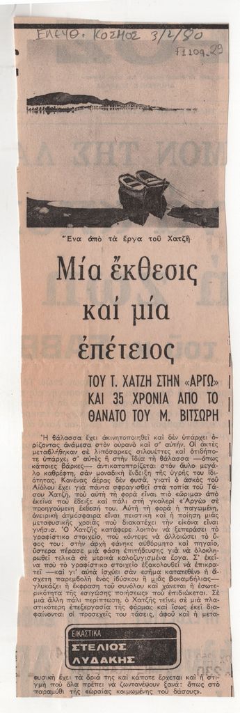 Απόκομμα, έντυπο, χαρτί, 26,6×8,5 εκ., όπου δημοσιεύεται, κριτική του Στέλιου Λυδάκης για την ατομική έκθεση ζωγραφικής του Τάσου Χατζή στην Αθήνα το 1980.