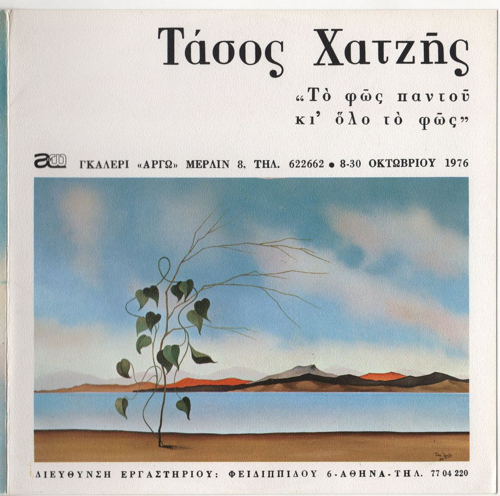Έντυπο της ατομικής έκθεσης ζωγραφικής του Τάσου Χατζή με τίτλο «Το φως παντού κι όλο το φως» στην Αθήνα το 1976. Περιέχει σύντομο βιογραφικό καλλιτέχνη και αποσπάσματα κριτικών.