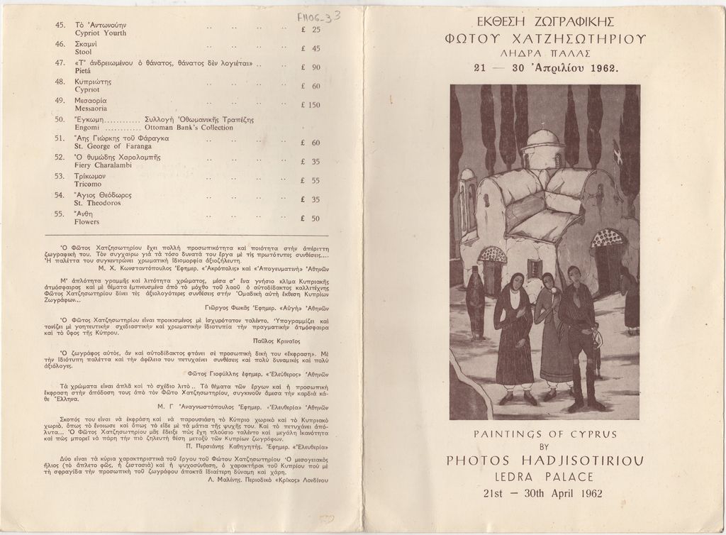 Έντυπο, χαρτόνι αναδιπλωμένο, 25×17.5 εκ., στα ελληνικά και σε αγγλική μετάφραση, έκθεσης του Φώτου Χατζησωτηρίου.