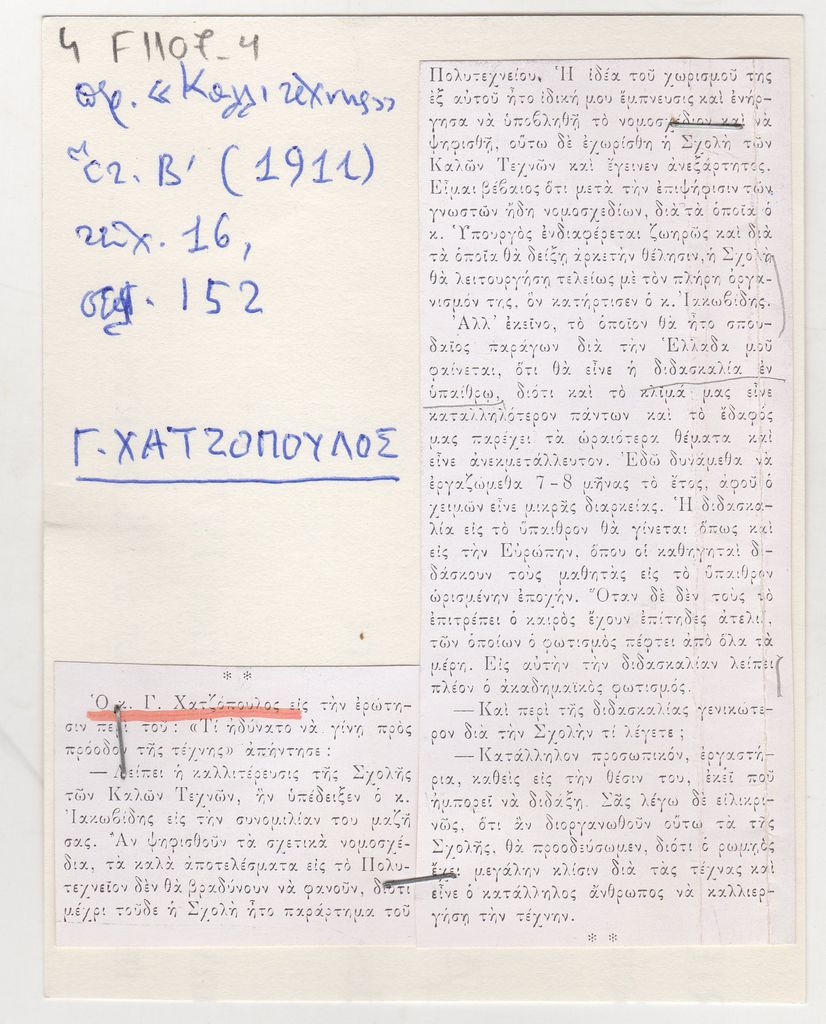 Φωτοαντίγραφο, χαρτί συρραμμένο σε απόκομμα εντύπου, 13×10 εκ., στα ελληνικά, δημοσίευσης συνέντευξης του Γιώργου Χατζόπουλου, αναφορικά με την Τέχνη.