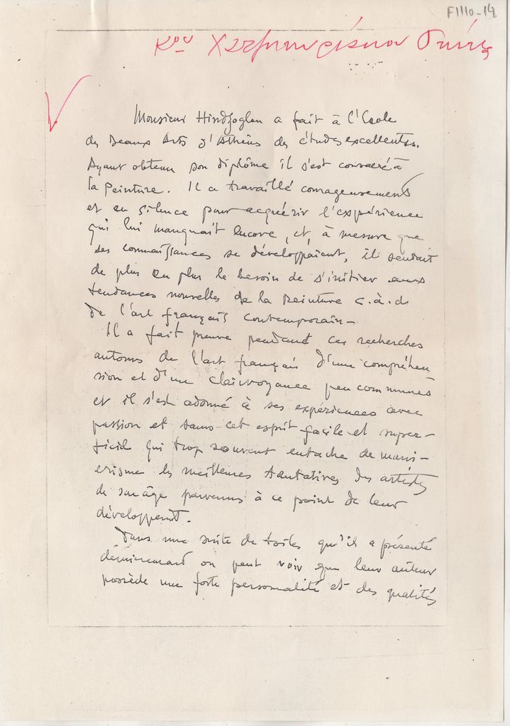 Φωτοαντίγραφο χειρόγραφης συστατικής επιστολής του Νίκου Χατζηκυριάκου-Γκίκα, για τον Γιώργου Χίντζογλου, χαρτί, 2 φφ, 29×21 εκ., στα γαλλικά.