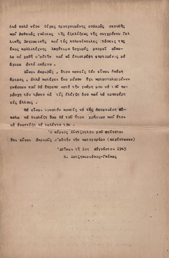 Μετάφραση συστατικής επιστολής του Νίκου Χατζηκυριάκου-Γκίκα για τον Γιώργο Χίντζογλου, χαρτί διπλής όψης, 29×21 εκ., στα ελληνικά.