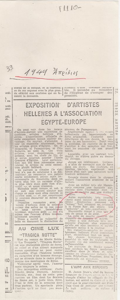 Φωτοαντίγραφο, χαρτί, 29.5×21 εκ., στα γαλλικά, δημοσίευσης άρθρου αναφερόμενου σε έκθεση Ελλήνων καλλιτεχνών στην Αίγυπτο. Δίνονται πληροφορίες για την έκθεση στην οποία μεταξύ άλλων συμμετέχει ο Γιώργος Χίντζογλου.