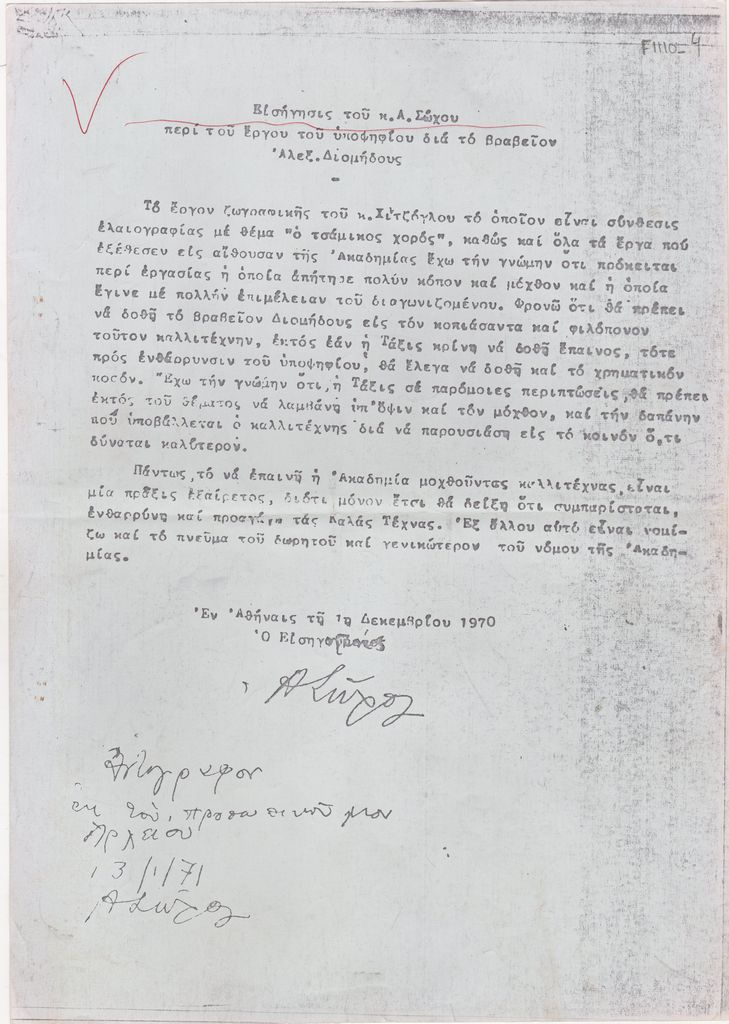 Φωτοαντίγραφο δακτυλόγραφης εισήγησης, χαρτί, 29×21 εκ., στα ελληνικά, του Αντώνιου Σώχου για τον Γιώργο Χίντζογλου. Πρόκειται για κριτική έργου με το οποίο καλλιτέχνης συμμετέχει σε διαγωνισμό για το βραβείο “Αλέξ. Διομήδους”.
