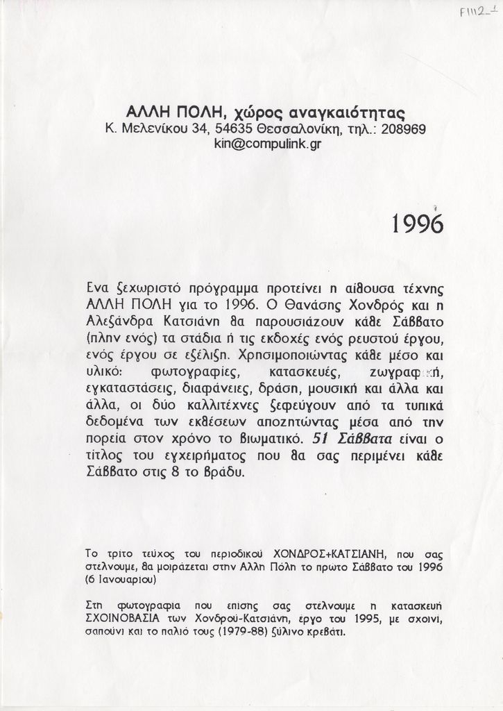 Φωτοαντίγραφο δελτίου Τύπου, χαρτί, 29.5×21 εκ., στα ελληνικά, έκθεσης/project των Αλεξάνδρας Κατσιάνη και Θανάση Χονδρού με τίτλο “51 Σάββατα”, στον χώρο “Άλλη Πόλη” στη Θεσσαλονίκη.
