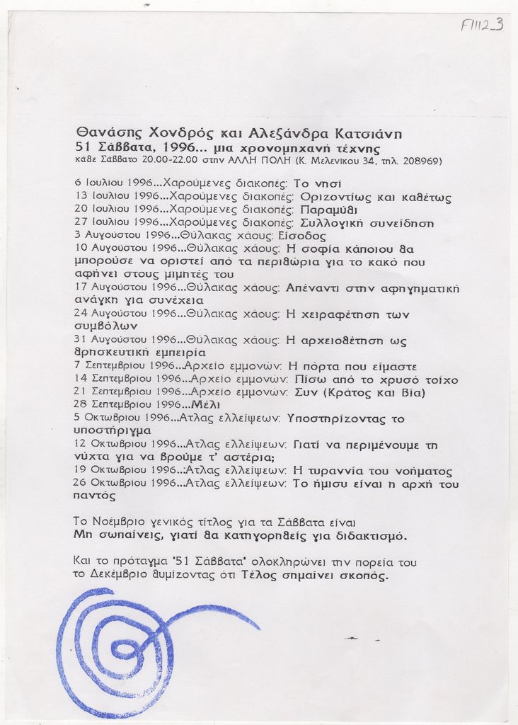 Φωτοαντίγραφο, χαρτί, 29.5×21 εκ., στα ελληνικά, έκθεσης/project των Αλεξάνδρας Κατσιάνη και Θανάση Χόνδρου στην αίθουσα “Άλλη Πόλη” στη Θεσσαλονίκη.