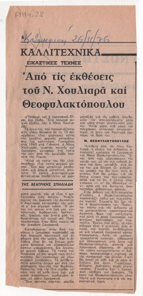 Απόκομμα, έντυπο, χαρτί, 24,8×11,2 εκ., όπου δημοσιεύεται, στα ελληνικά, κριτική της Βεατρίκης Σπηλιάδη για τις ατομικές εκθέσεις του Νίκου Χουλιαρά και του Μάκη Θεοφυλακτόπουλου στην Αθήνα το 1976. Επάνω επιγραφή.