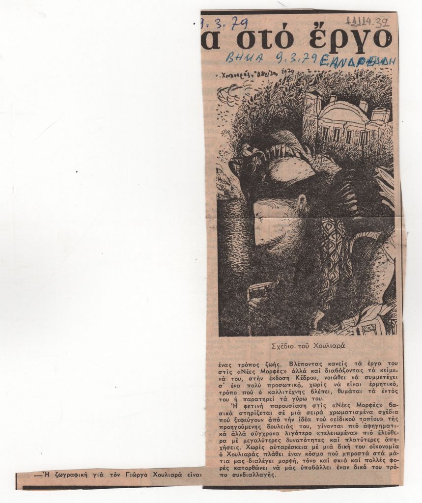Απόκομμα, έντυπο, χαρτί, 18,5×15,2 εκ. (ακανόνιστο σχήμα), όπου δημοσιεύεται, στα ελληνικά, κριτική του Έφης Ανδρεάδη για την ατομική έκθεση έργων του Νίκου Χουλιαρά στην Αθήνα το 1979. Επάνω, επιγραφή.