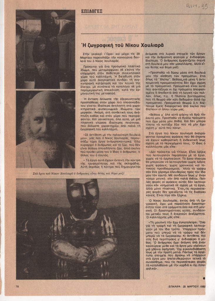 Συνέντευξη του ζωγράφου Νίκου Χουλιαρά με αφορμή την ατομική έκθεση έργων του στην Αθήνα το 1982.