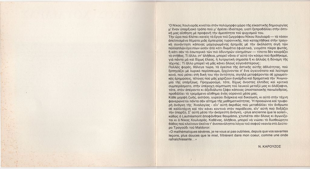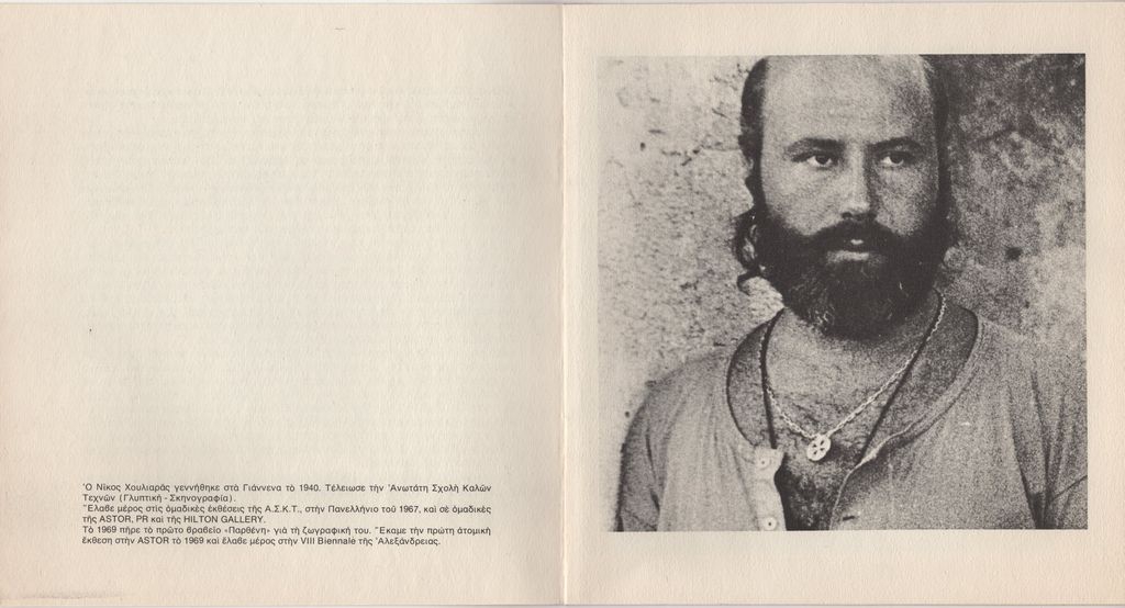 Έντυπο, στα ελληνικά, οκτάφυλλο, χαρτόνι και χαρτί, 21,5×20,0 εκ. Κατάλογος της ατομικής έκθεσης έργων του Νίκου Χουλιαρά στην Αθήνα το 1972. Περιέχει κείμενο για τον καλλιτέχνη του Νίκου Καρούζου και σύντομο βιογραφικό καλλιτέχνη. Στο εξώφυλλο και εσωτερικά, εικονογράφηση.
